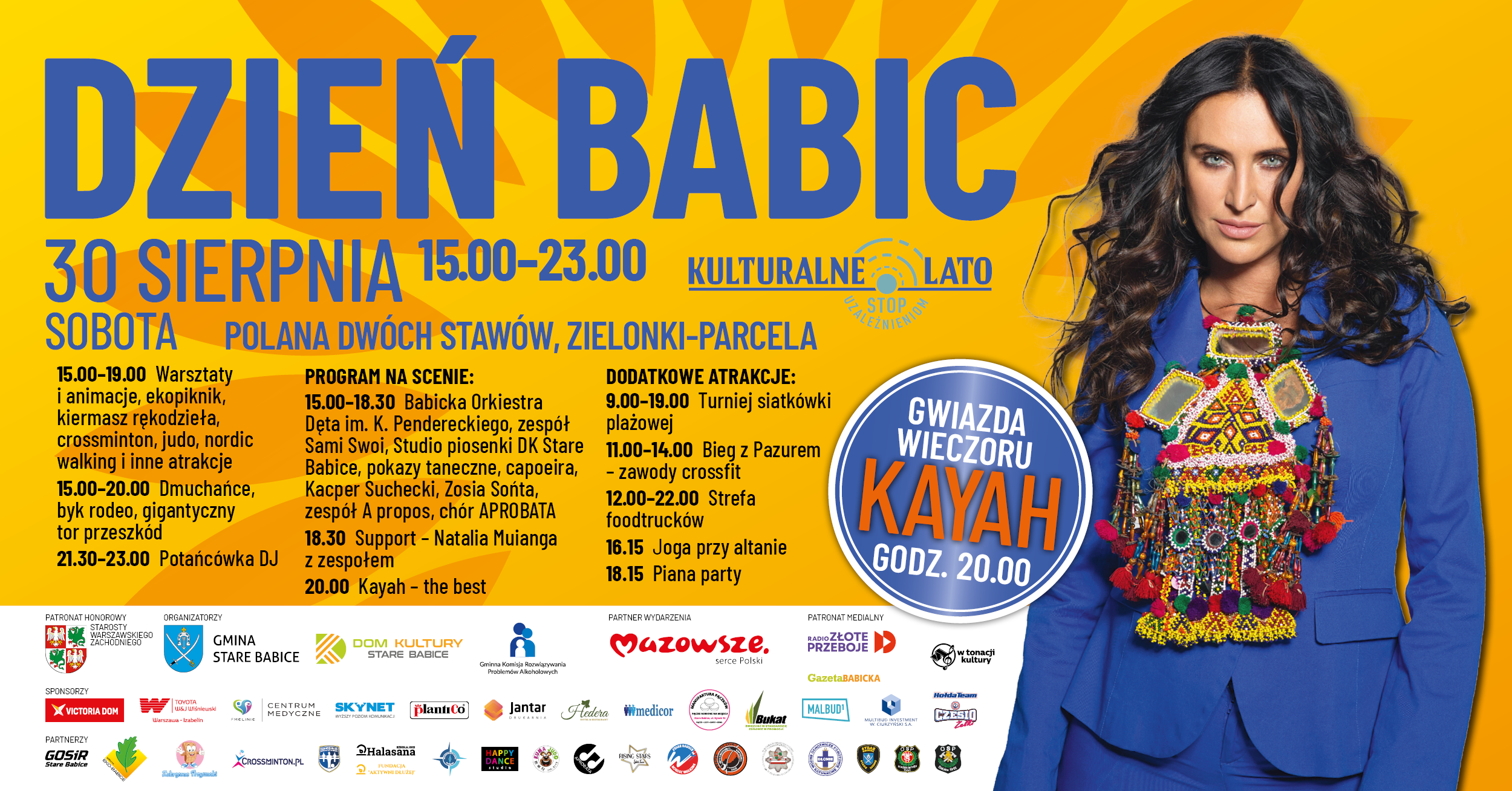 🔹 15:00-18:30 występ Babickiej Orkiestry Dętej im. K. Pendereckiego, Zespołu Sami Swoi, Studia Piosenki DK STARE BABICE, pokazy taneczne, capoeira, występy Zosi Sońty i Kacpra Sucheckiego, Zespołu A Propos i Chóru Aprobata