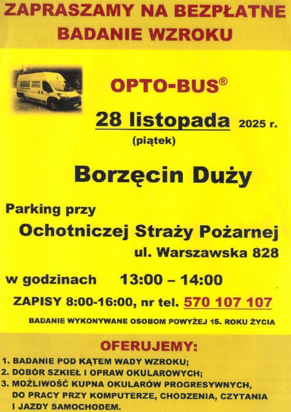 📣 Bezpłatne badanie wzroku 👁️🗨️ 23.10.2025 DRUKUJPOBIERZ DO PDF udostępnij 📣 Bezpłatne badanie wzroku 👁️🗨️ 📅 Data: 28 listopada 2025 (piątek) 📍 Miejsce: Borzęcin Duży – Parking przy Ochotniczej Straży Pożarnej ul. Warszawska 828 🕐 13:00-14:00 ☎️ Zapisy pod numerem: 570 107 107 Przyjdź i zadbaj o swoje oczy!