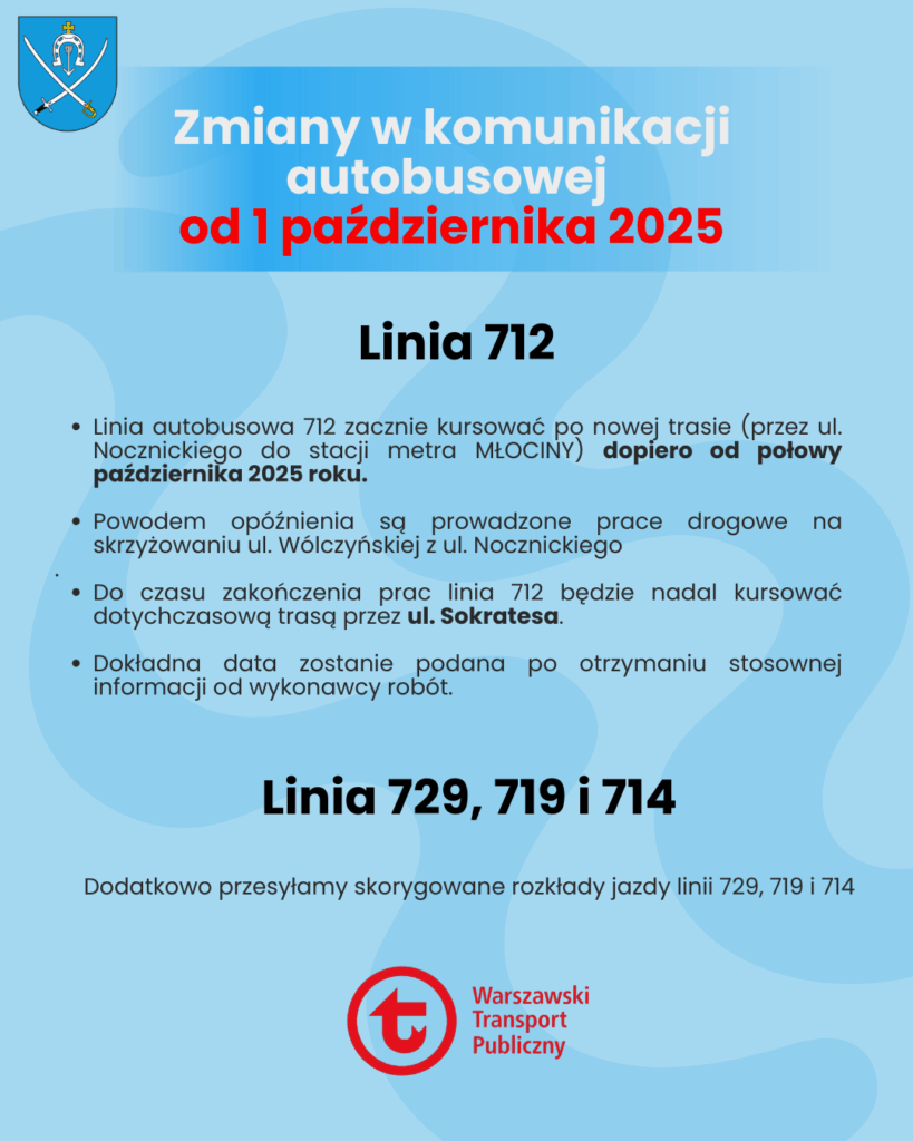 Linia autobusowa 712 zacznie kursować po nowej trasie (przez ul. Nocznickiego do stacji metra MŁOCINY) od 6 października 2025 roku.