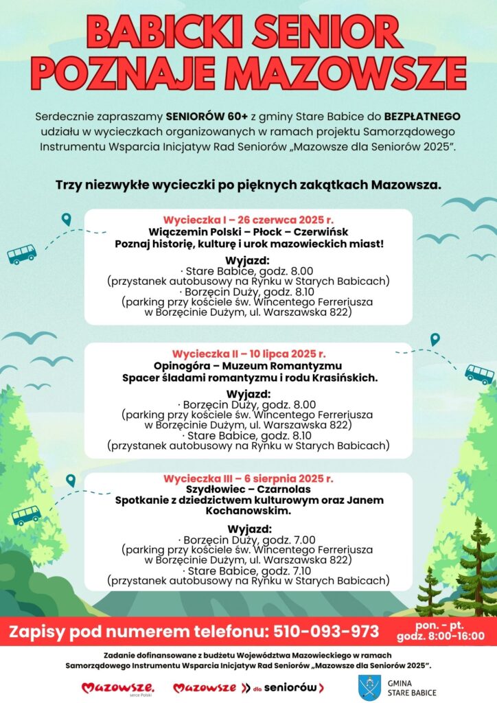 Serdecznie zapraszamy SENIORÓW 60+ z terenu gminy Stare Babice do udziału w BEZPŁATNYCH wycieczkach organizowanych w ramach projektu Samorządowego Instrumentu Wsparcia Inicjatyw Rad Seniorów „Mazowsze dla Seniorów 2025”.