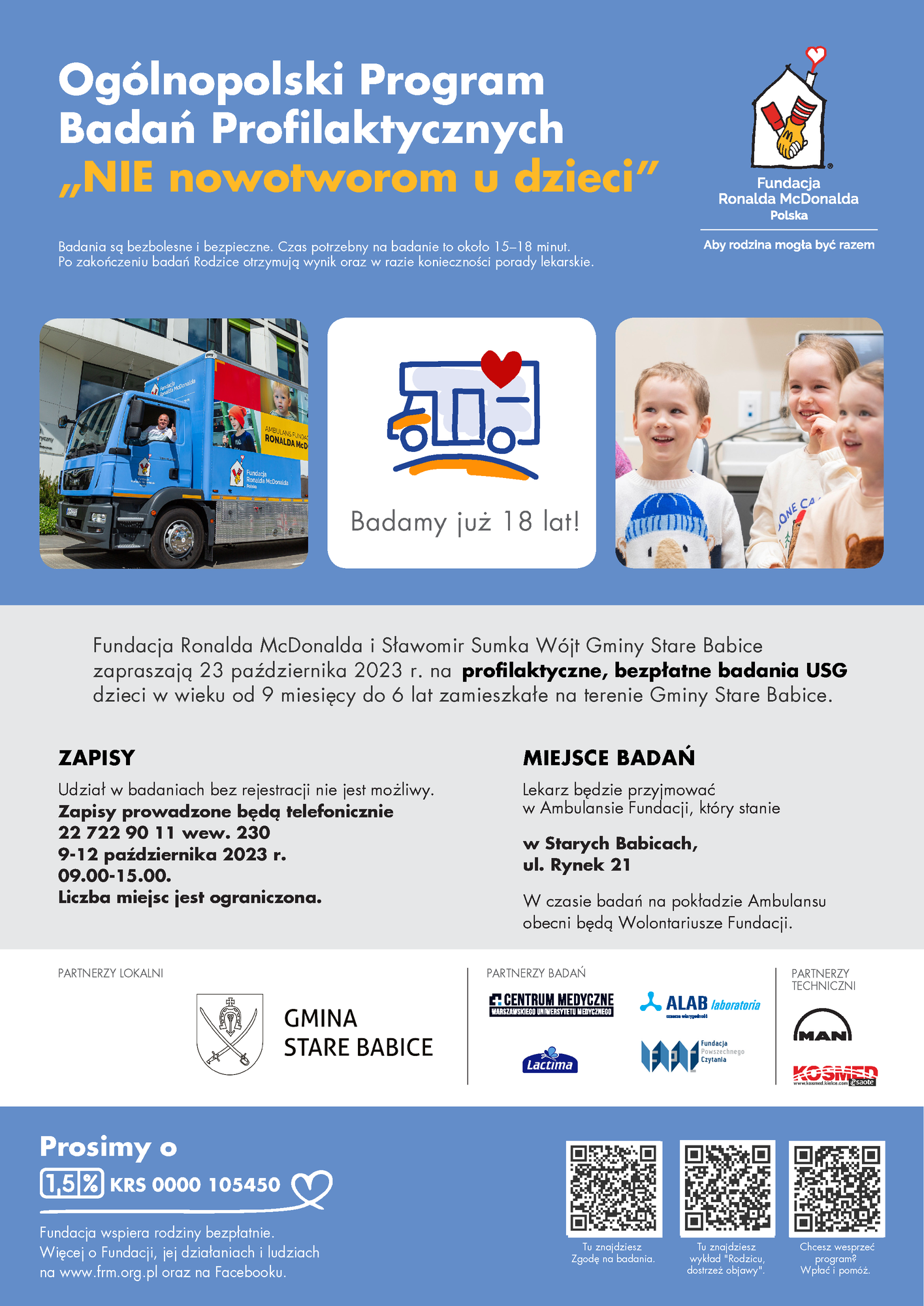 Fundacja Ronalda McDonalda oraz Wójt Gminy Stare Babice Sławomir Sumka zapraszają na profilaktyczne, bezpłatne badania USG dzieci w wieku od 9 miesięcy do 6 lat, które odbędą się 23 października 2023 roku.