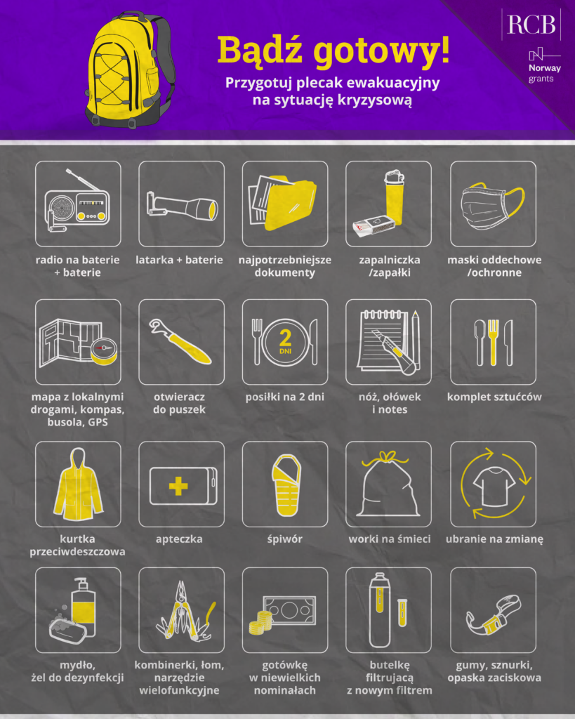 👉Rządowe Centrum Bezpieczeństwa radzi, żeby zadbać o wcześniejsze przygotowanie zestawu ewakuacyjnego. To, co powinno się w nim znaleźć widnieje na załączonej grafice.