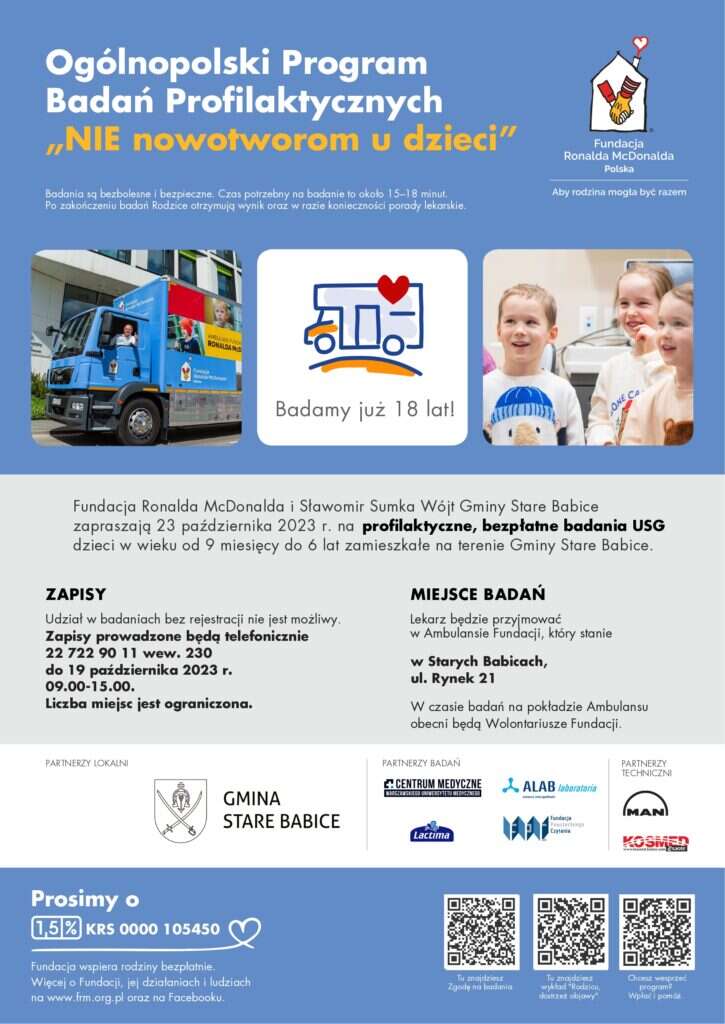 Fundacja Ronalda McDonalda i Sławomir Sumka Wójt Gminy Stare Babice zapraszają 23 października 2023 r. na profilaktyczne, bezpłatne badania USG dla dzieci w wieku od 9 miesięcy do 6 lat zamieszkałe na terenie Gminy Stare Babice.