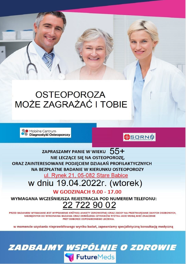 Badania prowadzone będą we wtorek 19 kwietnia 2022 r. w godzinach 9.00-17.00., w ambulansie Mobilnego Centrum Diagnostyki Osteoporozy, przy ul. Rynek 21, 05-082 Stare Babice.