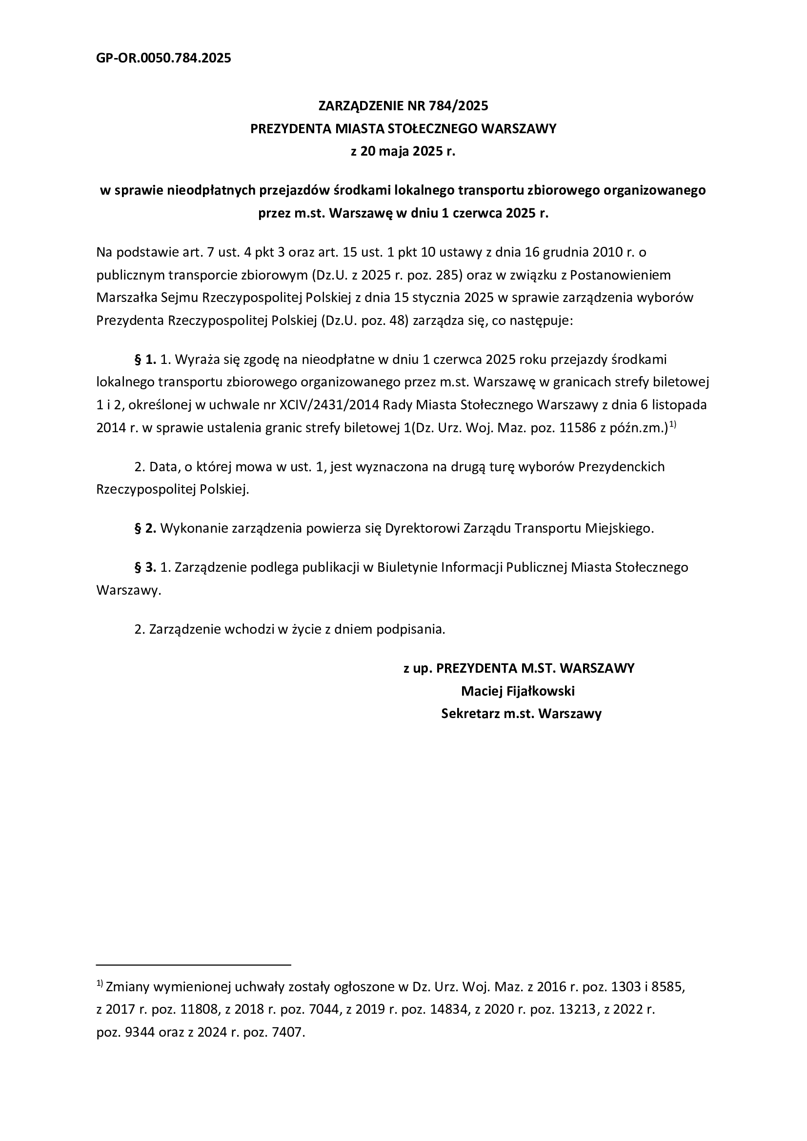 Zarządzenie 784-2025 w sprawie bezpłatnych przejazdów 1.06.2025