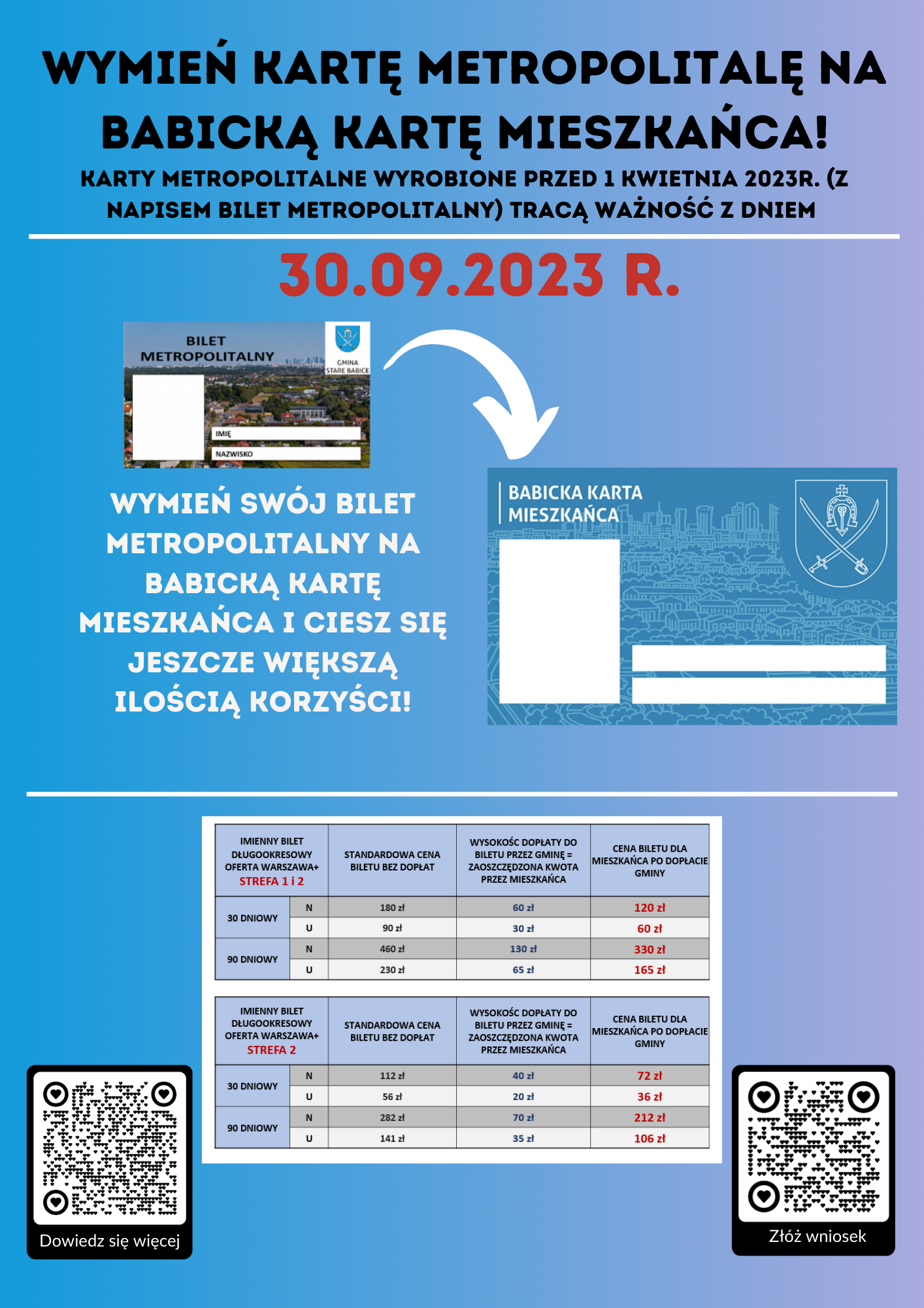Przypominamy o wymianie biletu metropolitalnego, który wygasa 30 września 2023 r. na Babicką Kartę Mieszkańca!