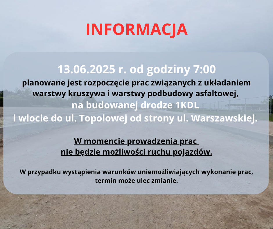 Informujemy, że 13.06.2025 r. od godziny 7.00 planowane jest rozpoczęcie prac związanych z układaniem warstwy kruszywa i warstwy podbudowy asfaltowej na budowanej drodze 1KDL i wlocie do ul. Topolowej od strony ul. Warszawskiej.