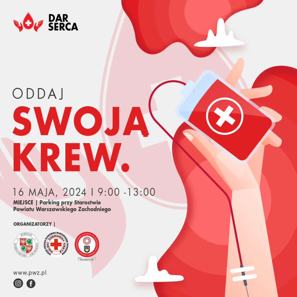 Ambulans będzie czekał na krwiodawców na parkingu przy budynku Starostwa Powiatu Warszawskiego Zachodniego w godz. 9.00 – 13.00.