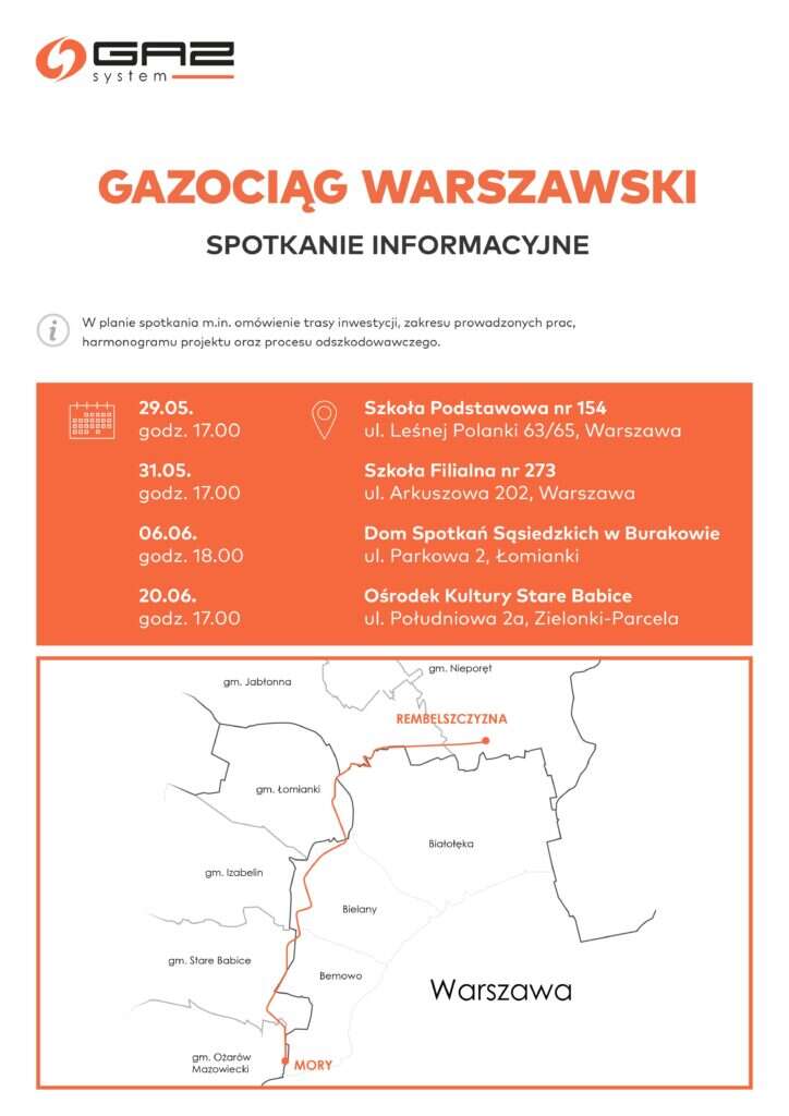 GAZ-SYSTEM zaprasza mieszkańców Starych Babic na spotkania dotyczące budowy Gazociągu Warszawskiego. Nowy gazociąg, który będzie liczył 28,5 km, połączy Rembelszczyznę z Morami. Trasa przebiegnie przez kilka podwarszawskich gmin i trzy stołeczne dzielnice. Prace budowlane rozpoczną się już w czerwcu tego roku.