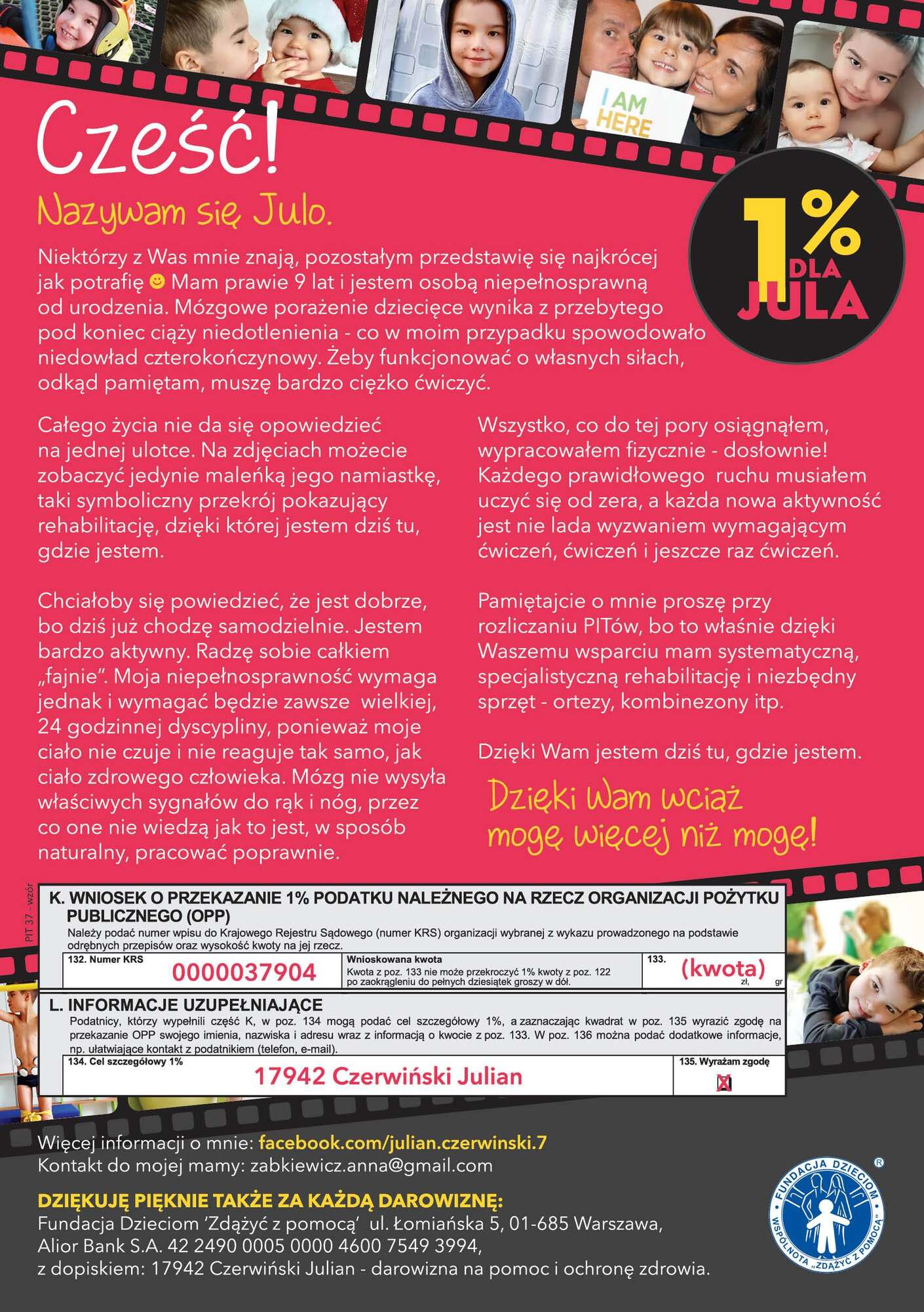 Jeśli nie zdecydowali Państwo jeszcze na jaki cel przeznaczyć swój 1% podatku, gorąco zachęcam do wsparcia Julka – mieszkańca naszej Gminy.