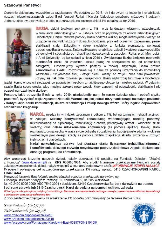 Serdeczna prośba o przekazanie 1% podatku dla Basi i Karolka.