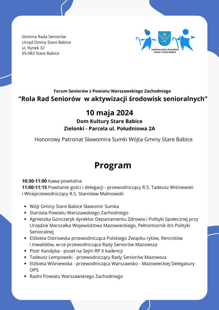 Starobabicka Rada Seniorów, zaprosiła delegacje osób starszych z 7-miu gmin Powiatu Warszawskiego Zachodniego; Błonia, Izabelina, Kampinosu, Leszna, Łomianek,Ożarowa Mazowieckiego, Starych Babic należących do- UTW, Klubów Seniora , PZERiI, Kół Gospodyń Wiejskich do udziału w forum poświęconemu roli Rad Seniorów w aktywizacji środowisk senioralnych.