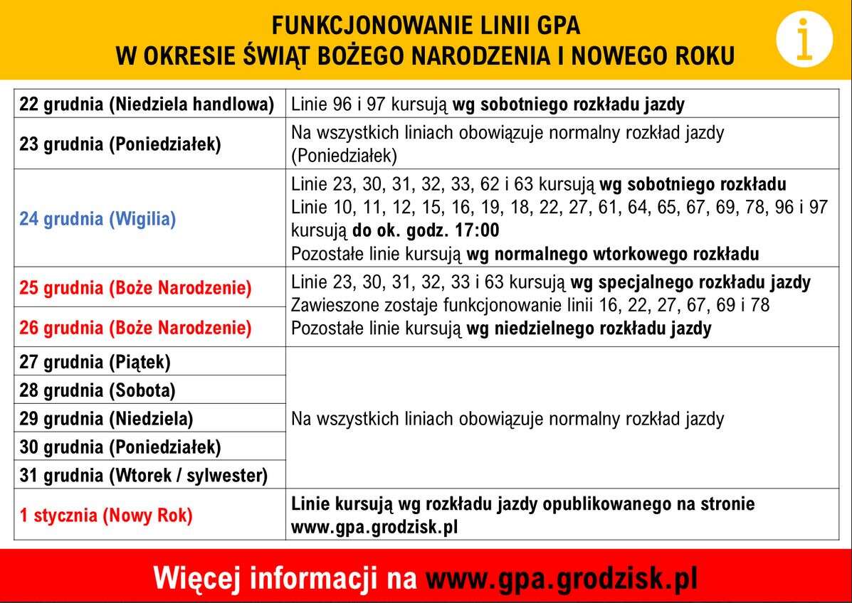 W najbliższym czasie – na stronie https://gpa.grodzisk.pl/rozklady-mapy-regulamin-i-taryfa/ rozkłady jazdy na 2025 rok zostaną opublikowane także w formie tabel PDF.
