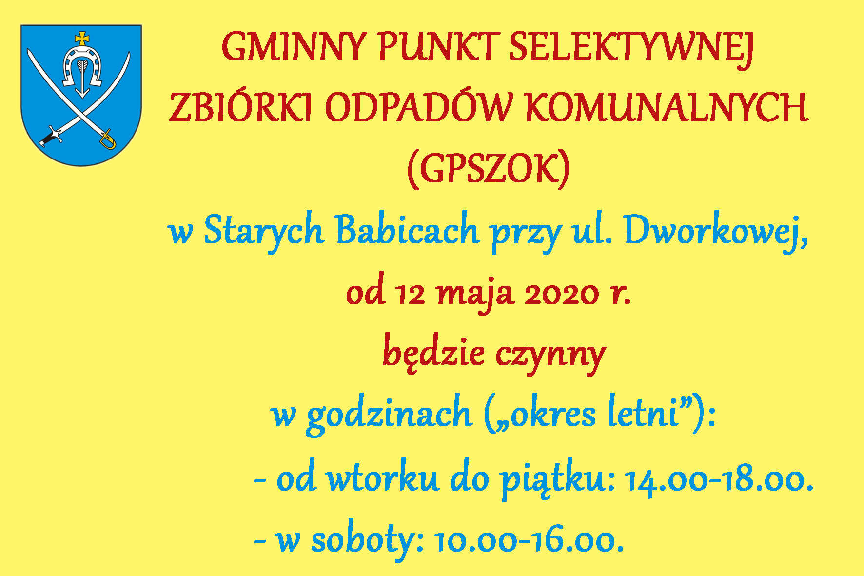 Uprzejmie informujemy, że Gminny Punkt Selektywnej Zbiórki Odpadów Komunalnych (GPSZOK) w Starych Babicach, przy ul. Dworkowej,