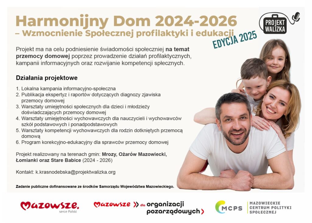 Fundacja Projekt Walizka zaprasza mieszkańców gminy Stare Babice do udziału w projekcie „Harmonijny Dom 2024–2026: Wzmocnienie Społecznej Profilaktyki i Edukacji”, którego celem jest przeciwdziałanie przemocy domowej.
