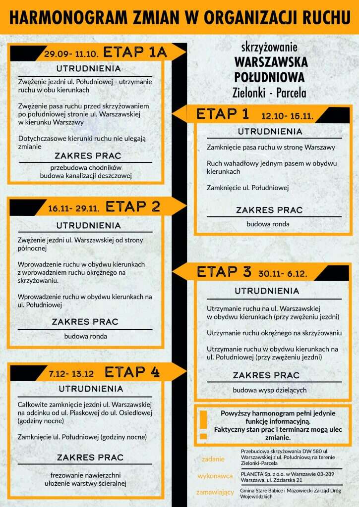 Harmonogram prac drogowych na skrzyżowaniach ul. Warszawskiej z ulicami Południową, Piłsudskiego i Reymonta