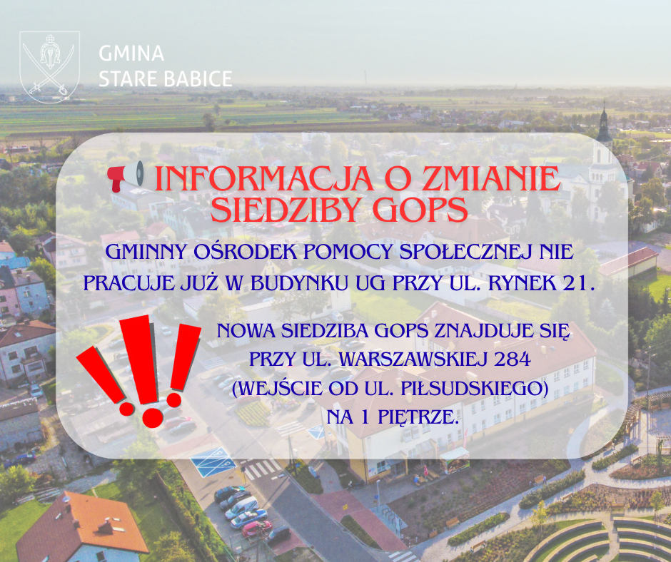 Informacja o zmianie siedziby GOPS 23.10.2025 DRUKUJPOBIERZ DO PDF udostępnij ❌ Informujemy, że Gminny Ośrodek Pomocy Społecznej nie pracuje już w budynku UG przy ul. Rynek 21 ✅ Nowa Siedziba GOPS znajduje się przy ul. Warszawskiej 284 (wejście od ul. Piłsudskiego) na 1 piętrze.