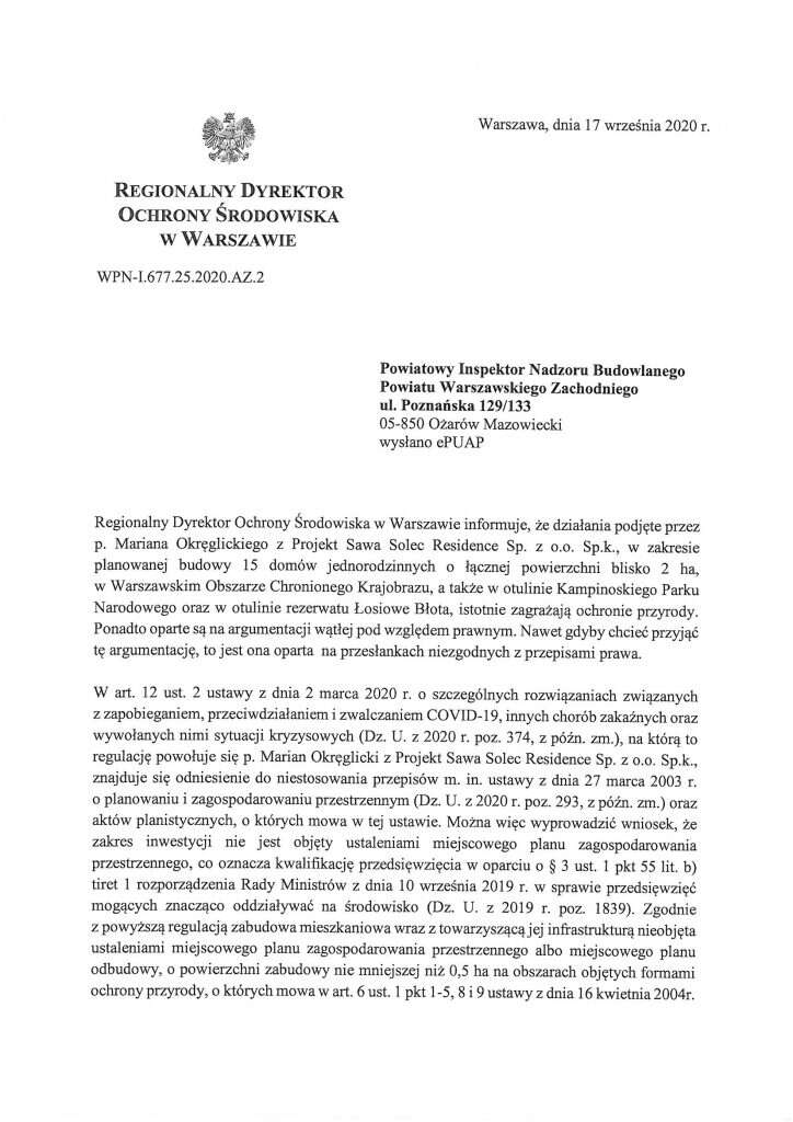 w związku z informacją otrzymaną od Regionalnego Dyrektora Ochrony Środowiska oraz Powiatowego Inspektora Nadzoru Budowlanego w sprawie działki nr 180 poniżej publikujemy otrzymaną korespondencję.