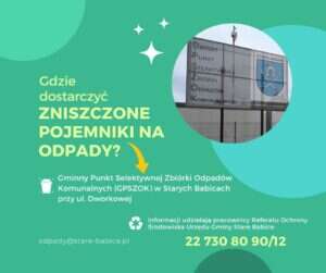Uprzejmie informujemy, że uszkodzone, niesprawne pojemniki na odpady komunalne (zmieszane), można dostarczyć do Gminnego Punktu Selektywnej Zbiórki Odpadów Komunalnych (GPSZOK) w Starych Babicach przy ul. Dworkowej (w godzinach pracy podając nr identyfikacyjny). Ponadto informujemy, że zgodnie z ustawą o utrzymaniu czystości i porządku w gminach właściciele nieruchomości zapewniają utrzymanie czystości i porządku m.in. przez wyposażenie … Czytaj dalej Informacja w sprawie niesprawnych pojemników na odpady