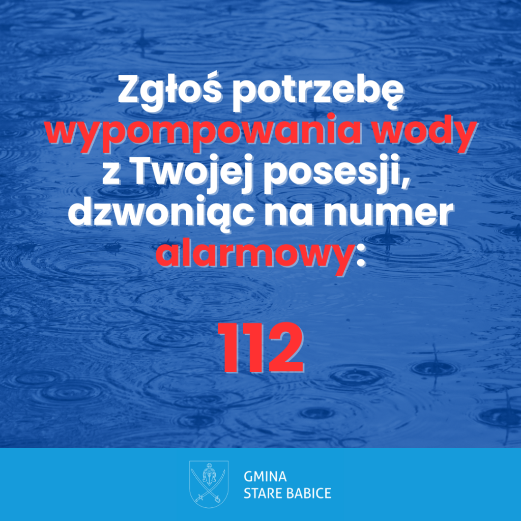 W związku z intensywnymi opadami deszczu, które miały miejsce zeszłej nocy, informujemy, że w przypadku wystąpienia zalania Państwa posesji lub innych poważnych szkód spowodowanych warunkami atmosferycznymi (deszcz, wiatr, itp.), należy niezwłocznie skontaktować się pod numer alarmowy 112.