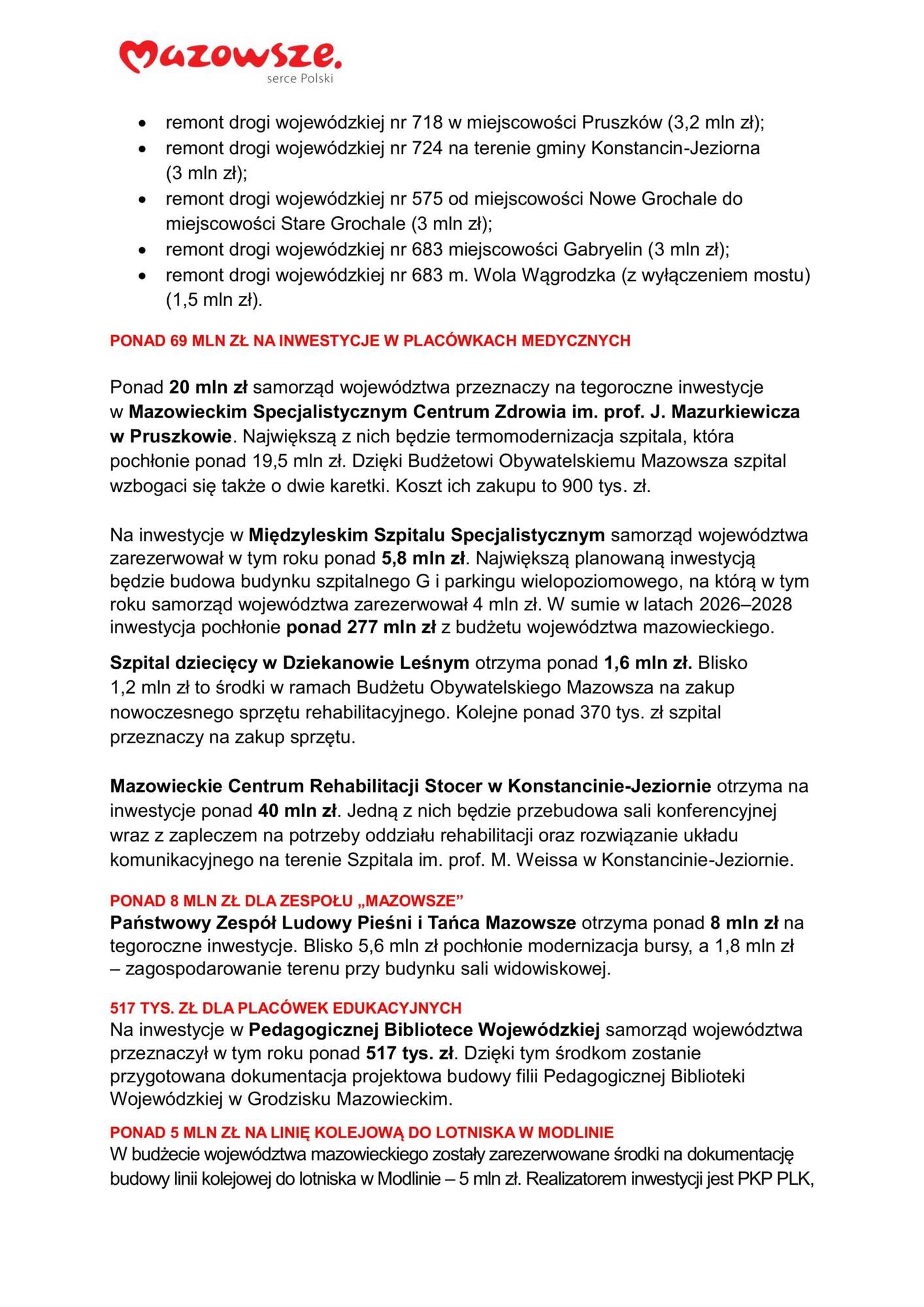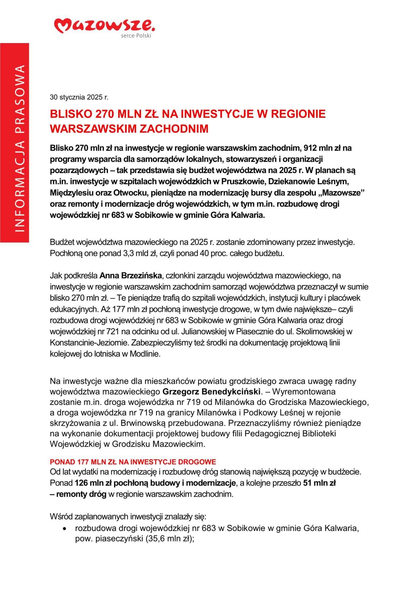 Powiat Warszawski Zachodni zaprasza na konferencję prasową pt. Inwestycje samorządu województwa w regionie warszawskim zachodnim w 2025 roku, która odbędzie się w dniu 30 stycznia 2025 r. o godz. 10.00.