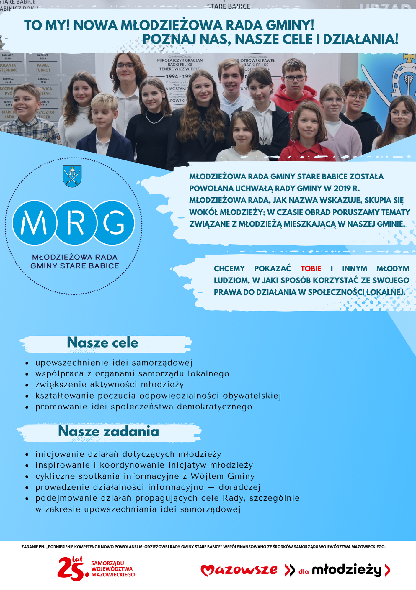 Zadanie pn. „Podniesienie kompetencji nowo powołanej Młodzieżowej Rady Gminy Stare Babice” współfinansowane ze środków Samorządu Województwa Mazowieckiego. 14 marca br. w Domu Kultury Stare Babice została podpisana umowa na dofinansowanie z Instrumentu „Mazowsze dla Młodzieży” zadania pn. „Podniesienie kompetencji nowo powołanej Młodzieżowej Rady Gminy Stare Babice” . Na ten cel Gmina Stare Babice pozyskała środki … Czytaj dalej Kampania informacyjno- promocyjna Młodzieżowej Rady Gminy