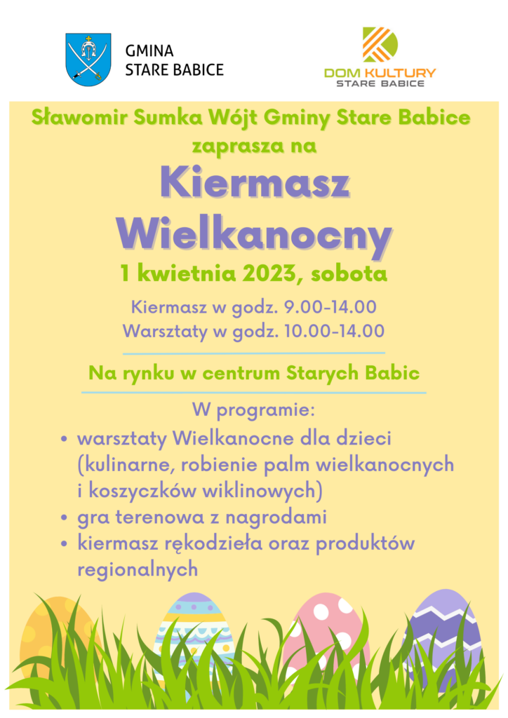 Z okazji zbliżających się Świąt Wielkanocnych zapraszamy wszystkich Mieszkańców na Kiermasz Wielkanocny, który odbędzie się w dniu 1 kwietnia 2023 r. na rynku przy Urzędzie Gminy Stare Babice.