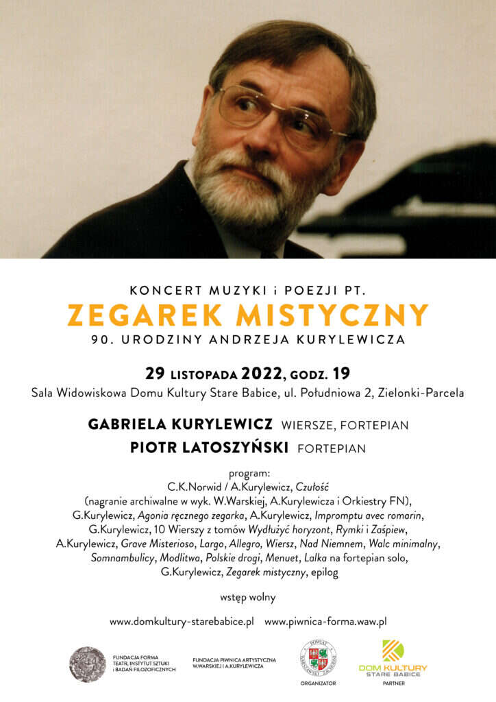 Serdecznie zapraszamy na koncert muzyki i poezji pt. „ZEGAREK MISTYCZNY 90. urodziny Andrzeja Kurylewicza”, który odbędzie się we wtorek 29 listopada 2022 o godz. 19.00 w Sali Widowiskowej Domu Kultury Stare Babice.