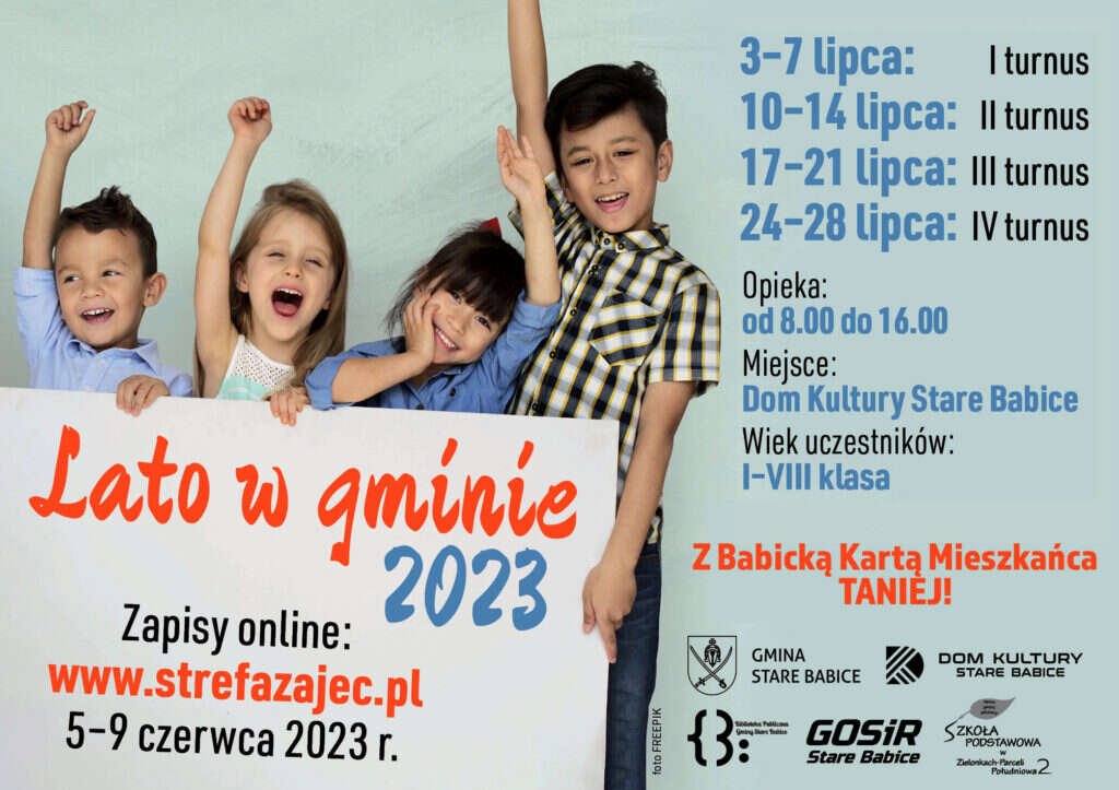 Przypominamy, że w dniach 5-9 czerwca 2023 r., na stronie www.strefazajec.pl będą trwały zapisy na cztery turnusy „Lata w Gminie”. Opieka nad dziećmi sprawowana będzie w godzinach 8.00-16.00.