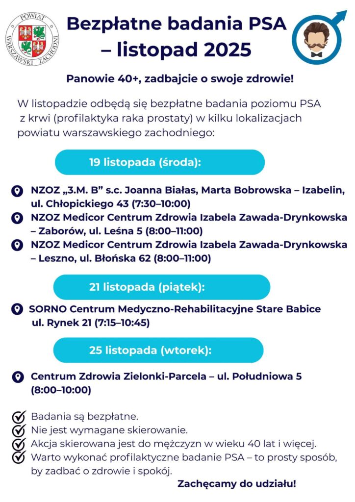 W listopadzie zapraszamy na bezpłatne badania poziomu PSA z krwi (profilaktyka raka prostaty) w kilku lokalizacjach powiatu warszawskiego zachodniego: