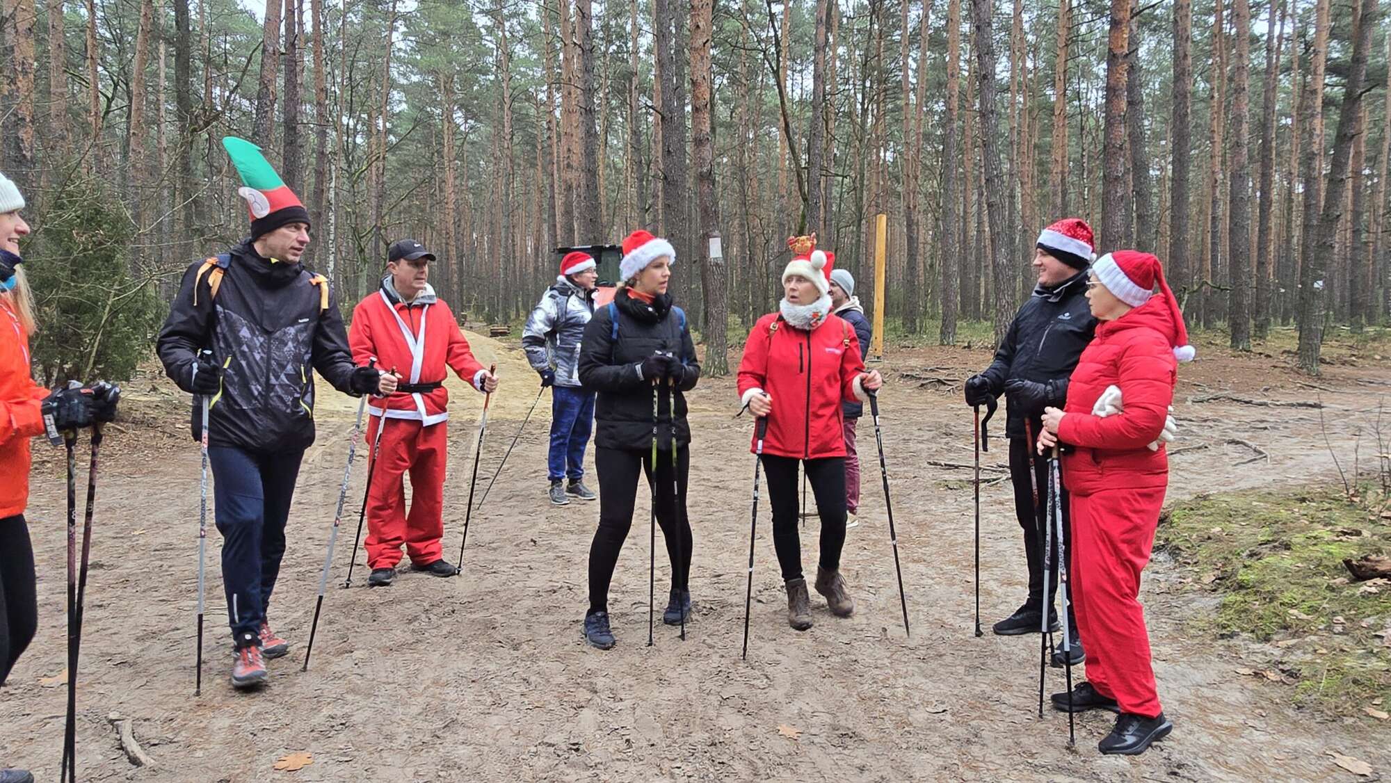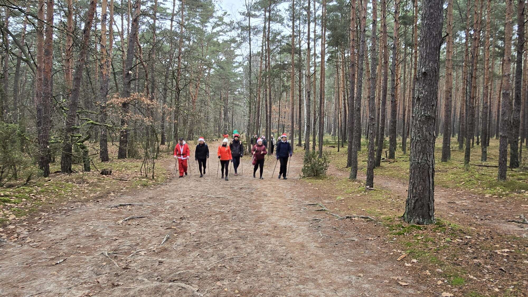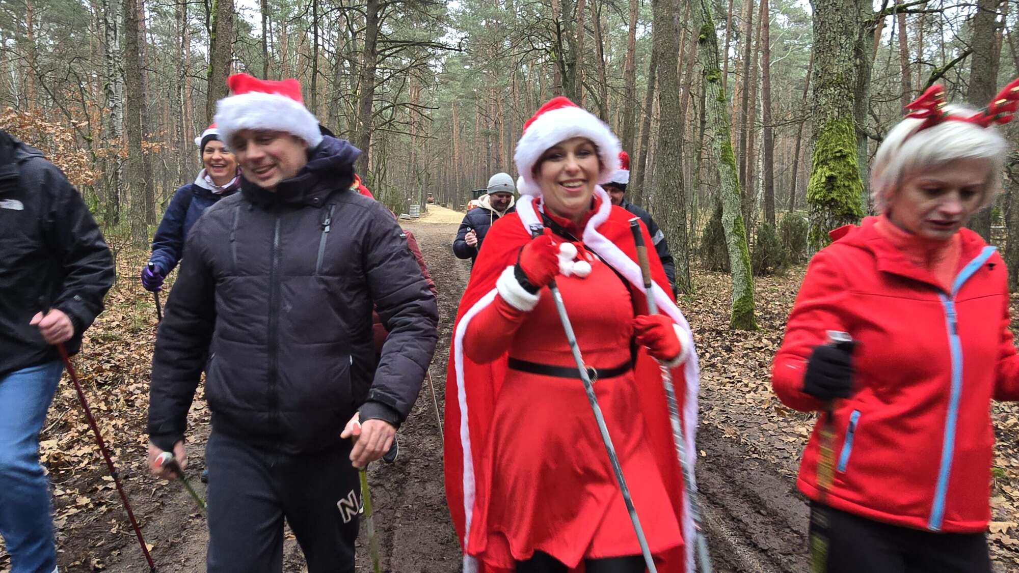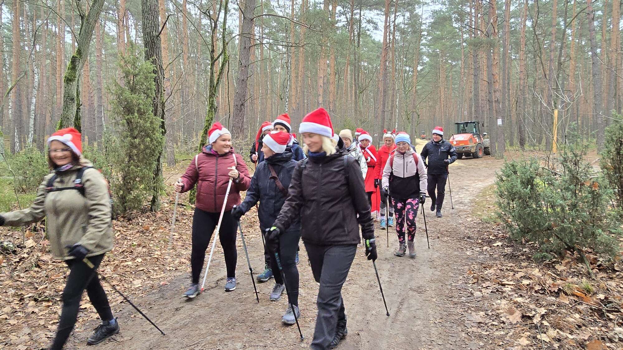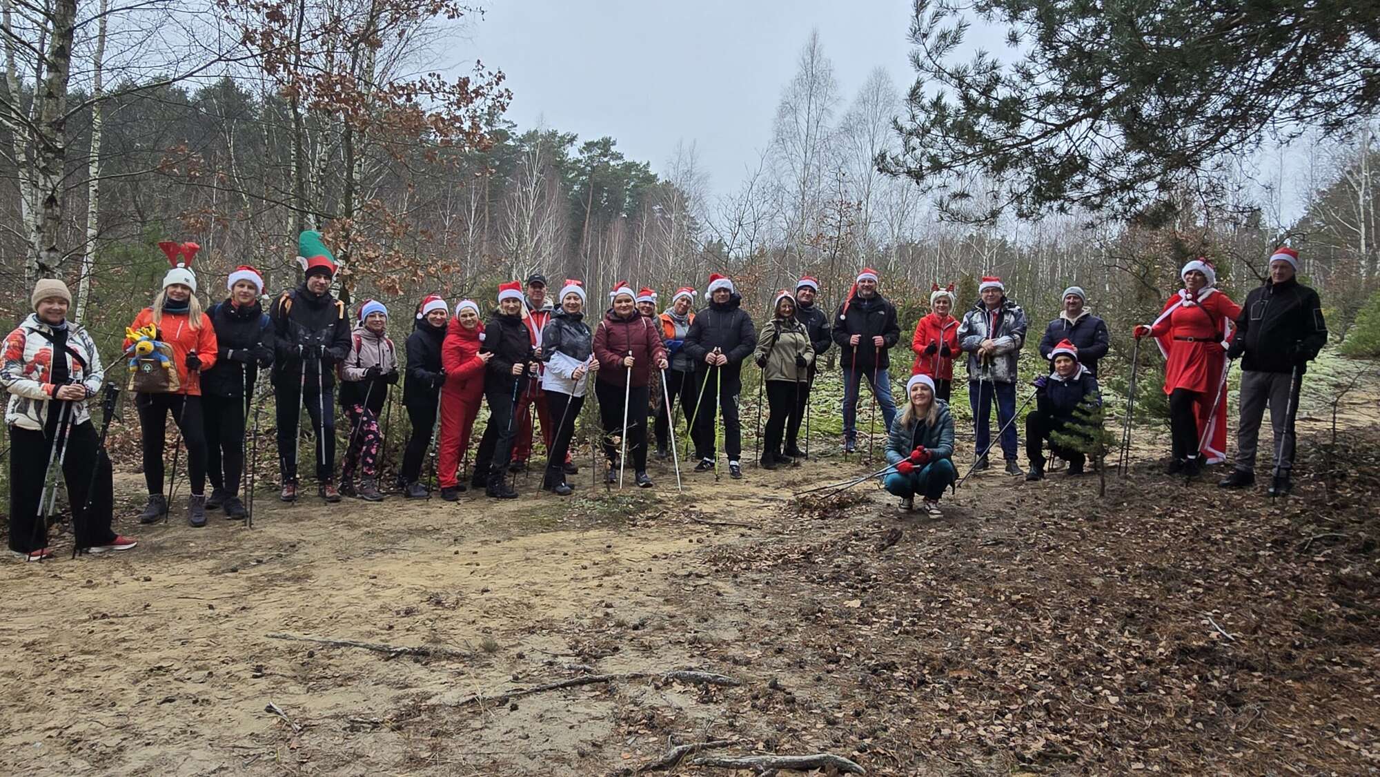 Pomimo chłodnego poranka, w Truskawiu na polanie zjawiła się fantastyczna grupa entuzjastów aktywności na świeżym powietrzu. Wszyscy uczestnicy, z kijkami w rękach i uśmiechami na twarzach, przywdziali obowiązkowe czapki Mikołaja, by dodać marszowi jeszcze więcej magii!