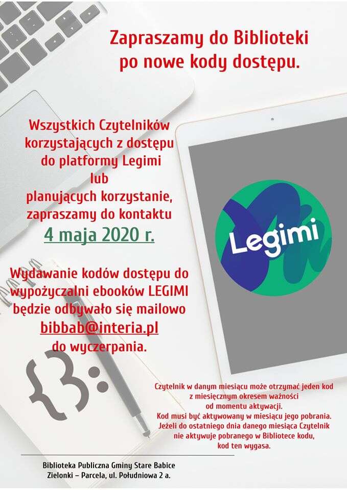 Biblioteka Publiczna Gminy Stare Babice zaprasza od 4 maja po nowe kody dostępu do wypożyczalni ebooków Legimi.
