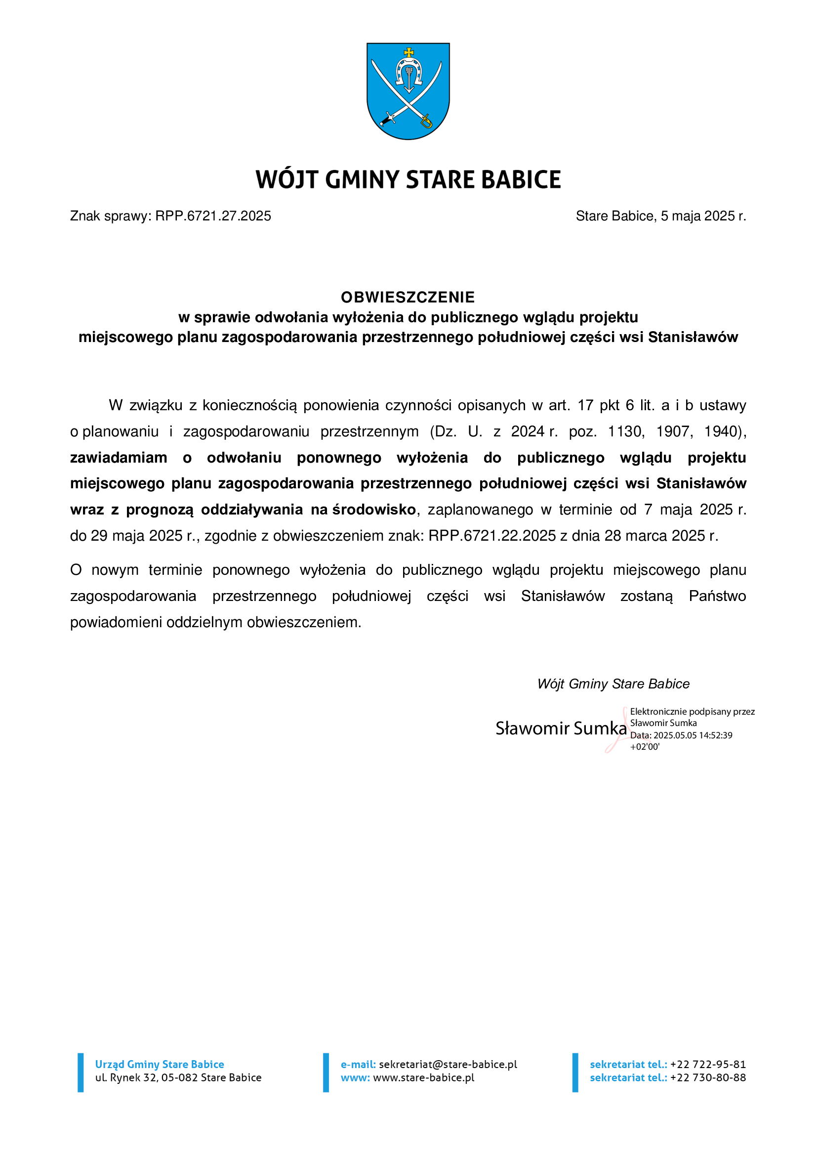 Obwieszczenie w sprawie odwołania wyłożenia do publicznego wglądu projektu miejscowego planu zagospodarowania przestrzennego południowej części wsi Stanisławów.pdf