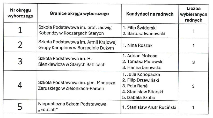 Na podstawie § 25 ust. 4 oraz § 25a Uchwały Nr XII/ 106/2019 Rady Gminy Stare Babice z dnia 26 września 2019 r. w sprawie powołania Młodzieżowej Rady Gminy Stare Babice i nadania jej statutu (Dz. Urz. Woj. Mazow. poz. 12079 z późn. zm.) podaję do publicznej wiadomości informację o zgłoszonych kandydatach na Radnych do Młodzieżowej Rady Gminy Stare Babice w wyborach zarządzonych na dzień 28 października 2025 r. w następujących okręgach: