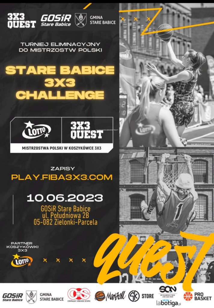 Z wielką radością zapraszamy Państwa na turniej eliminacyjny koszykówki 3×3, który jest częścią cyklu Lotto Quest 3×3. Turniej odbędzie się w dniu 10 czerwca 2023 r. na terenie GOSiR Stare Babice w Zielonkach-Parceli. Rozgrywki obejmują udział 16 zespołów z całej Polski. Rywalizacja zostanie podjęta na oficjalnych boiskach i koszach FIBA 3×3. Najlepsze trzy zespoły otrzymają nagrody pieniężne, a zwycięzca zapewni sobie udział w finale Mistrzostw Polski. Będzie to doskonała okazja do zobaczenia rywalizacji najlepszych drużyn w kraju.