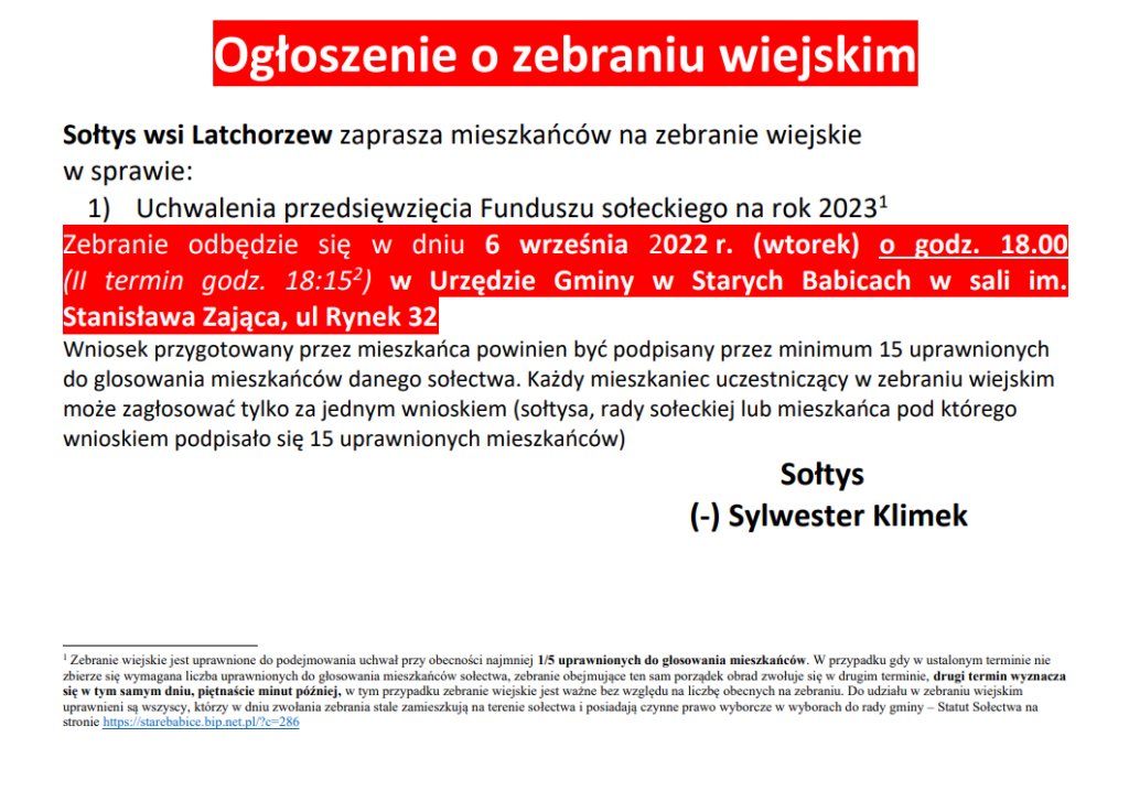 Ogłoszenie o zebraniu wiejskim wsi Latchorzew