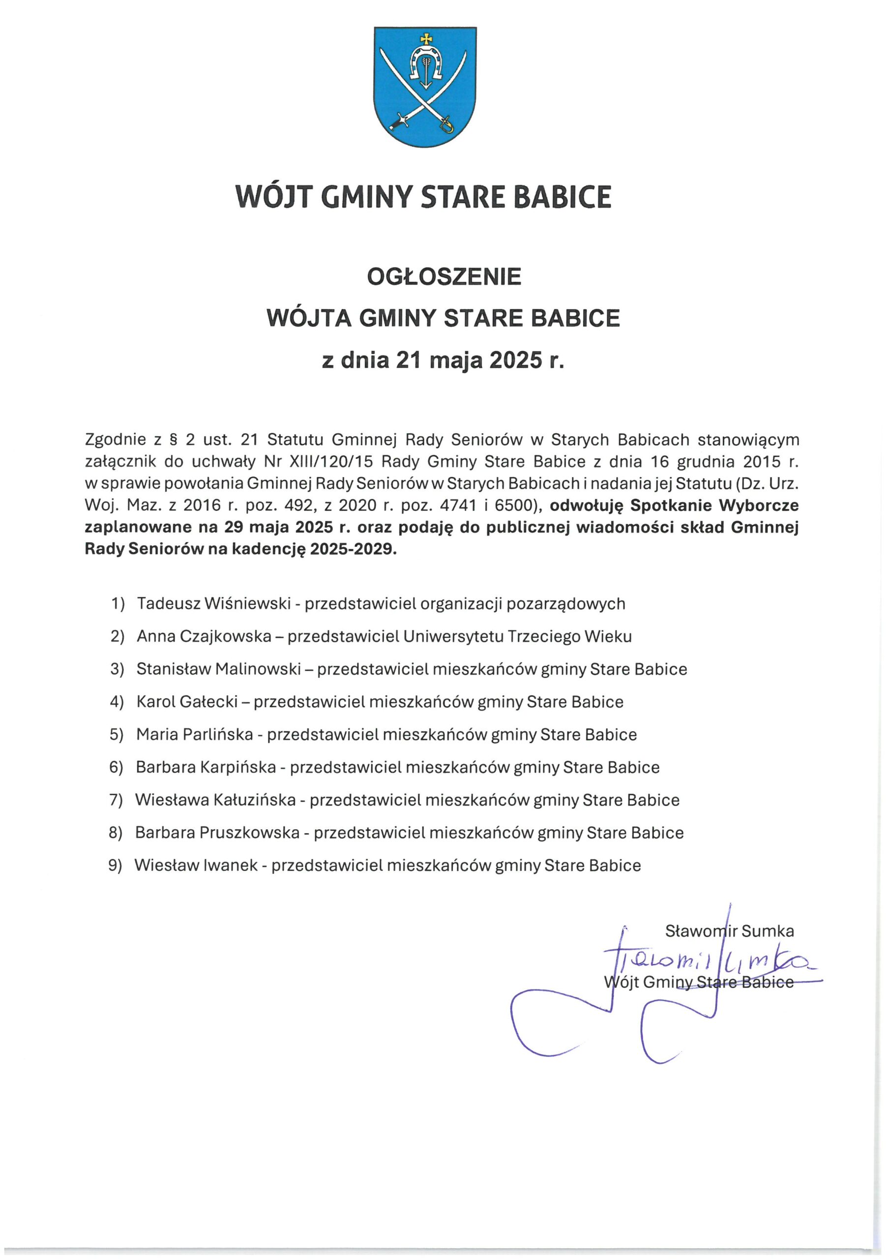 Zgodnie z § 2 ust. 21 Statutu Gminnej Rady Seniorów w Starych Babicach stanowiącym załącznik do uchwały Nr XIII/120/15 Rady Gminy Stare Babice z dnia 16 grudnia 2015 r. w sprawie powołania Gminnej Rady Seniorów w Starych Babicach i nadania jej Statutu (Dz. Urz. Woj. Maz. z 2016 r. poz. 492, z 2020 r. poz. 4741 i 6500), odwołuję Spotkanie Wyborcze zaplanowane na 29 maja 2025 r. oraz podaję do publicznej wiadomości skład Gminnej Rady Seniorów na kadencję 2025-2029.
