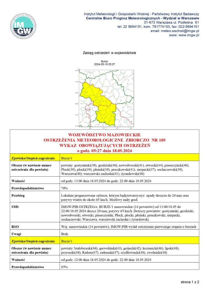 Instytut Meteorologii i Gospodarki Wodnej – Państwowy Instytut Badawczy wydał ostrzeżenie meteorologiczne nr 105.