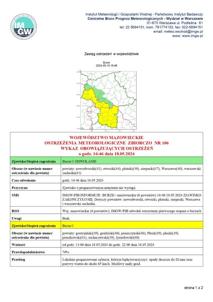 Instytut Meteorologii i Gospodarki Wodnej – Państwowy Instytut Badawczy wydało ODWOŁUJE ostrzeżenie nr 106.