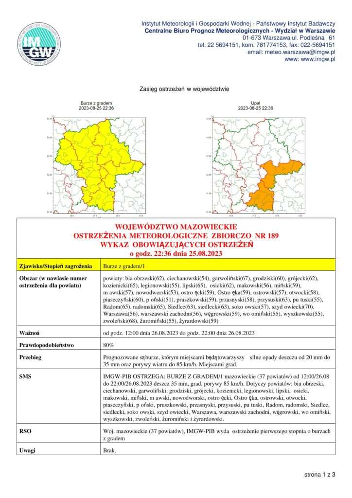 Instytut Meteorologii i Gospodarki Wodnej wydał ostrzeżenie meteorologiczne nr 189.