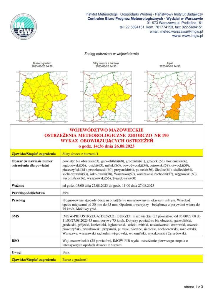 Instytut Meteorologii i Gospodarki Wodnej wydał ostrzeżenie meteorologiczne nr 190.