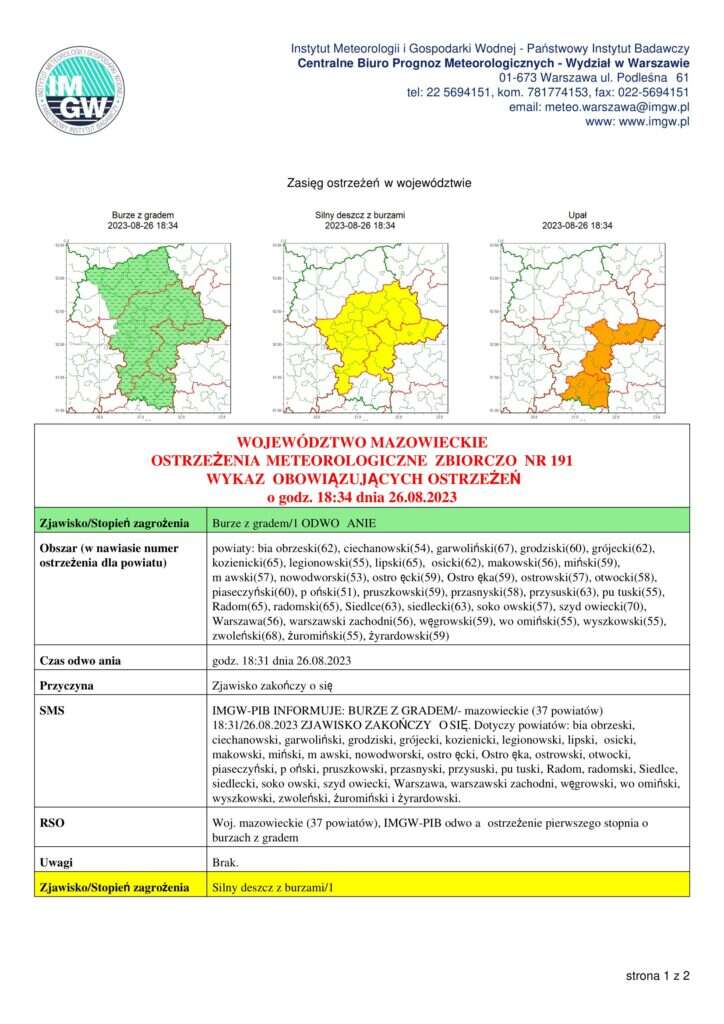 Instytut Meteorologii i Gospodarki Wodnej wydał ostrzeżenie meteorologiczne nr 191.