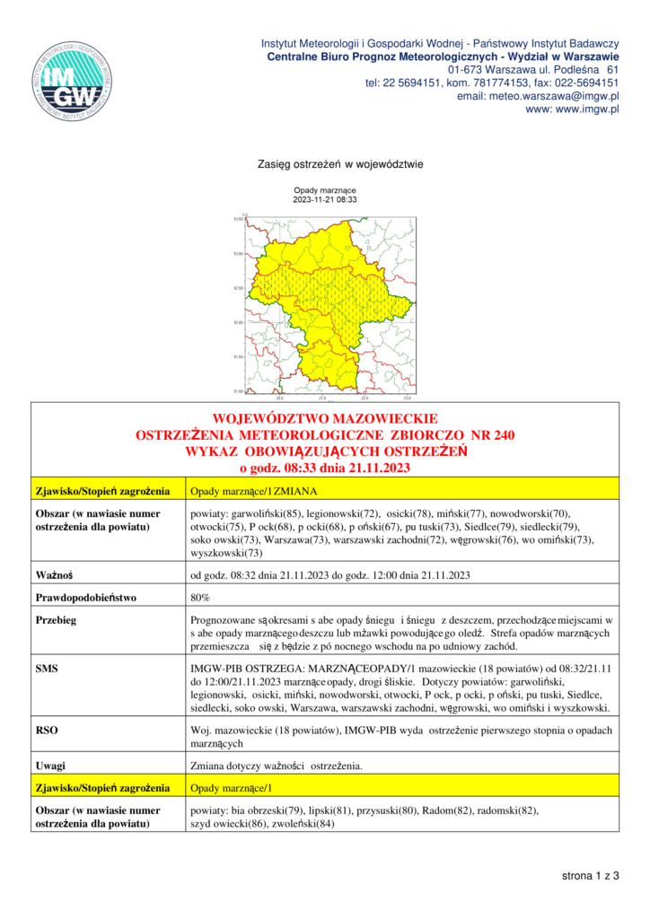 Ostrzeżenie meteorologiczne nr 240 – opady marznące /zmiana