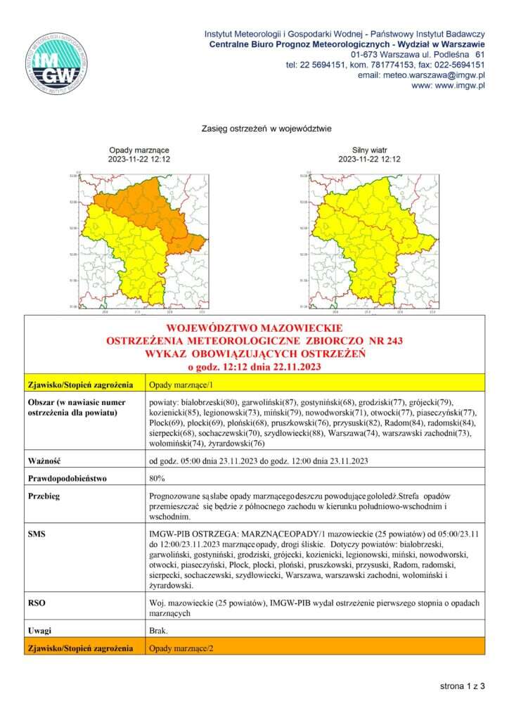 Instytut Meteorologii i Gospodarki Wodnej wydał ostrzeżenie meteorologiczne nr 243.