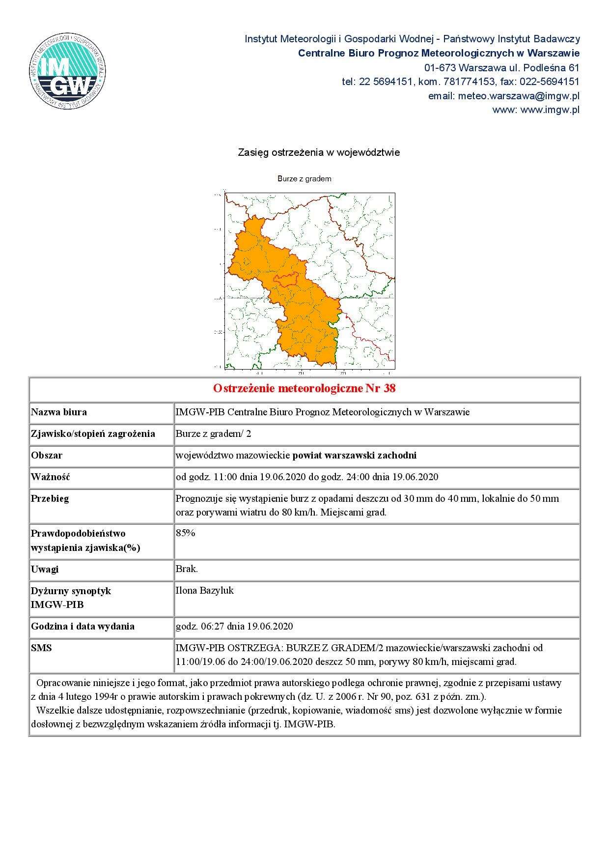 IMGW-PIB Centralne Biuro Prognoz Meteorologicznych w Warszawie ostrzega: