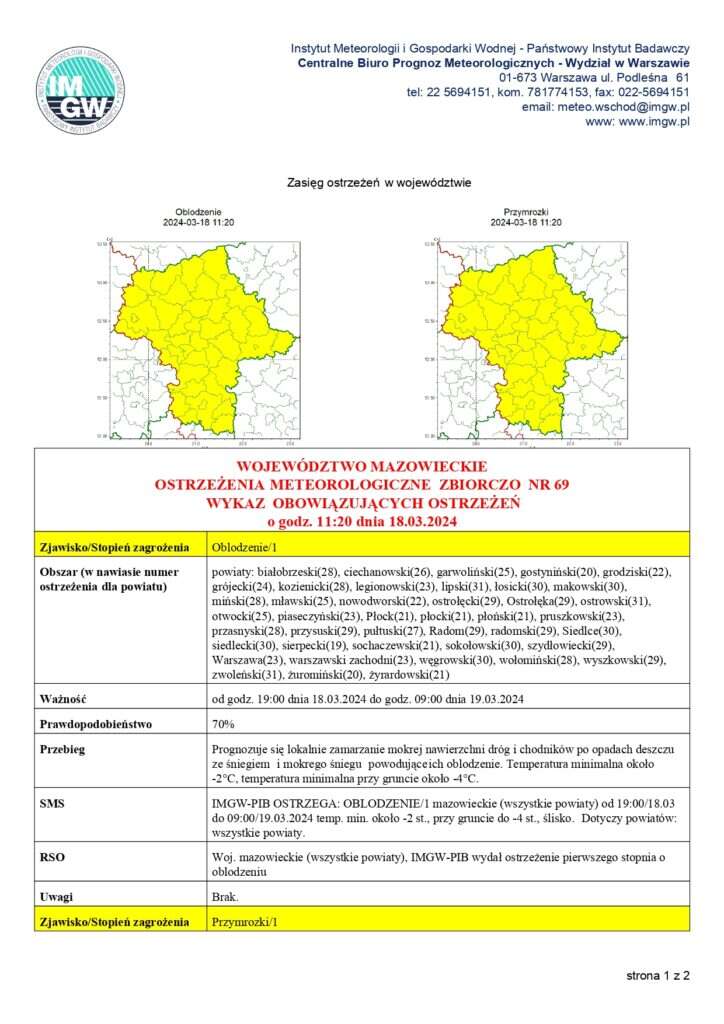 Wydział Zarządzania Kryzysowego i Spraw Obronnych Starostwa Powiatu Warszawskiego Zachodniego wydał ostrzeżenie meteorologiczne nr 69.