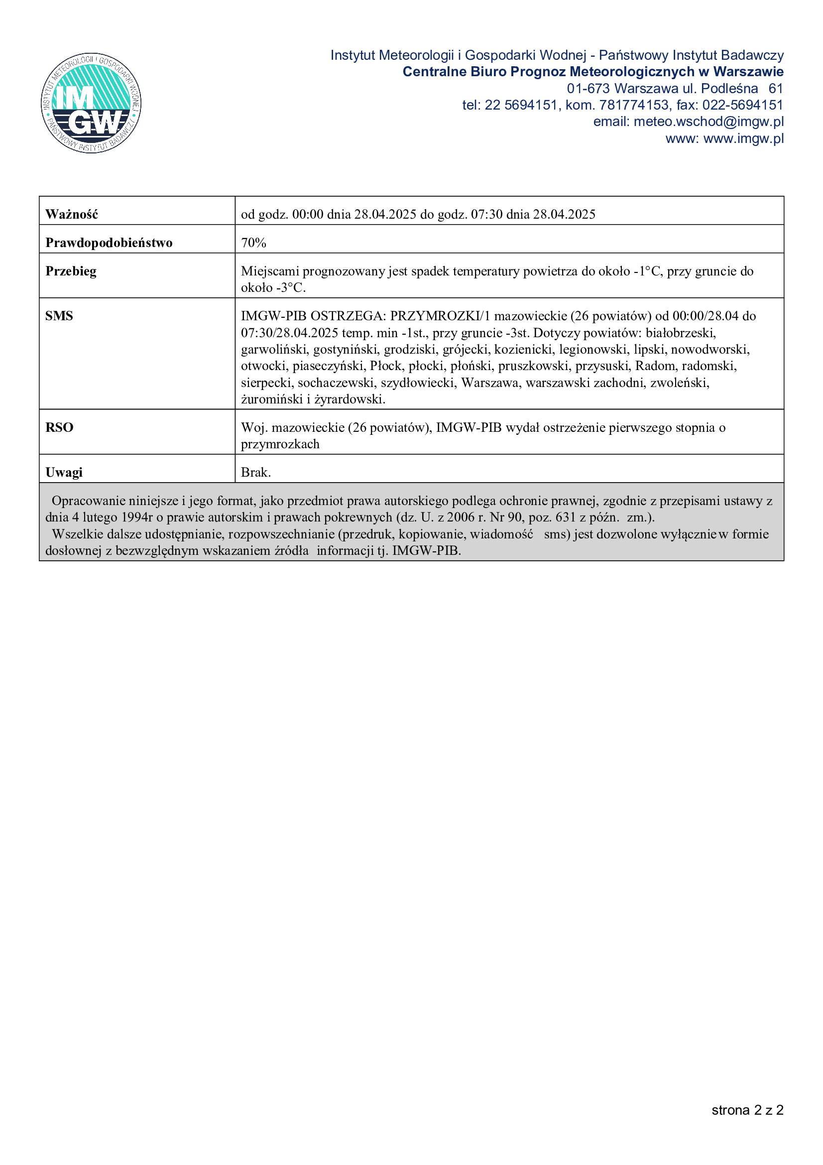 Instytut Meteorologii i Gospodarki Wodnej – Państwowy Instytut Badawczy wydał ostrzeżenie meteorologiczne nr 74.