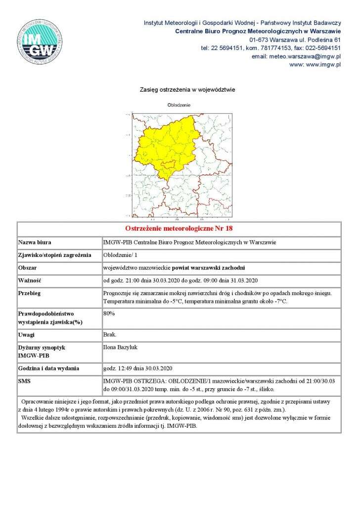 IMGW-PIB Centralne Biuro Prognoz Meteorologicznych w Warszawie prognozuje zamarzanie mokrej nawierzchni dróg i chodników po opadach mokrego śniegu na terenie powiatu warszawskiego zachodniego w dniach od 30.03.2020 r od godz. 21:00 do 31.03.2020 r. do godz. 9:00