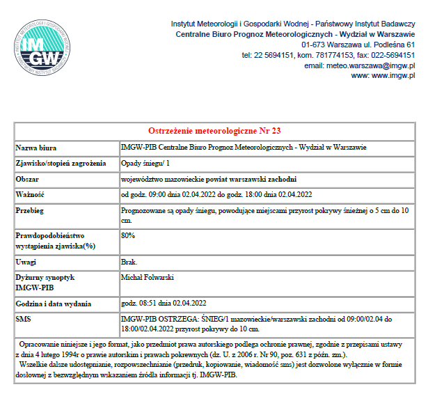 IMGW-PIB Centralne Biuro Prognoz Meteorologicznych Wydział w Warszawie wydało ostrzeżenie meteorologiczne nr 23.