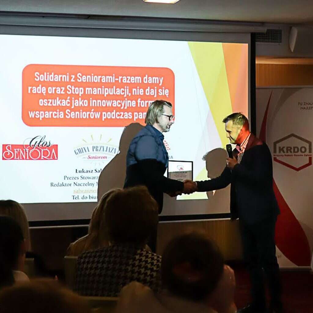 Podczas konferencji, Prezes Stowarzyszenia MANKO i redaktor naczelnego magazynu „Głos Seniora” – Pan Łukasz Salwarowski, wręczył Wójtowi Gminy Stare Babice Sławomirowi Sumce oraz Sekretarzowi Gminnej Rady Seniorów Annie Czajkowskiej certyfikaty potwierdzające partnerstwo Gminy Stare Babice i Gminnej Rady Seniorów.